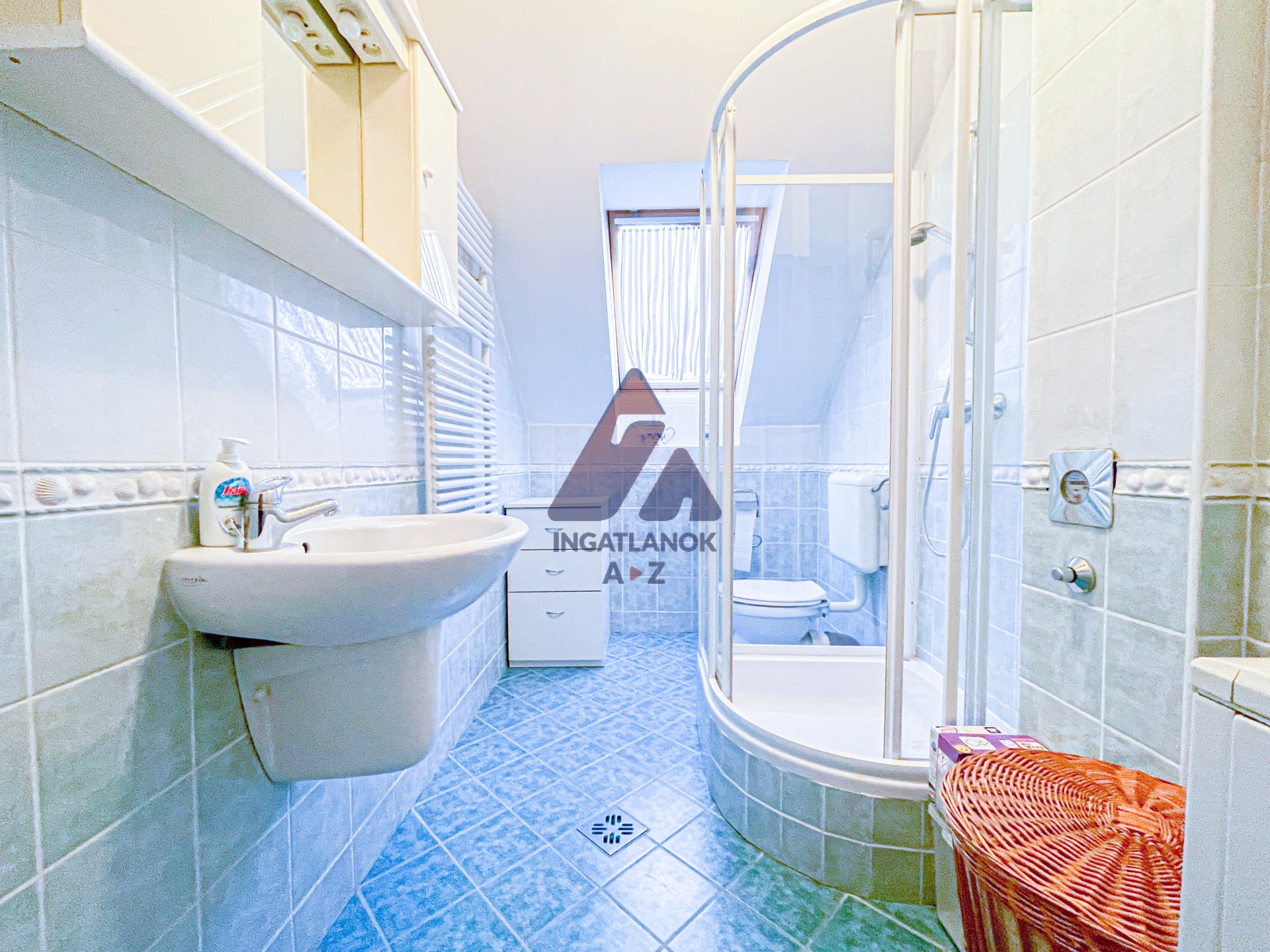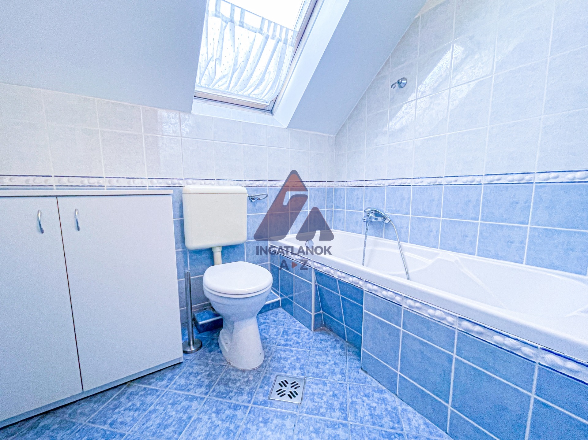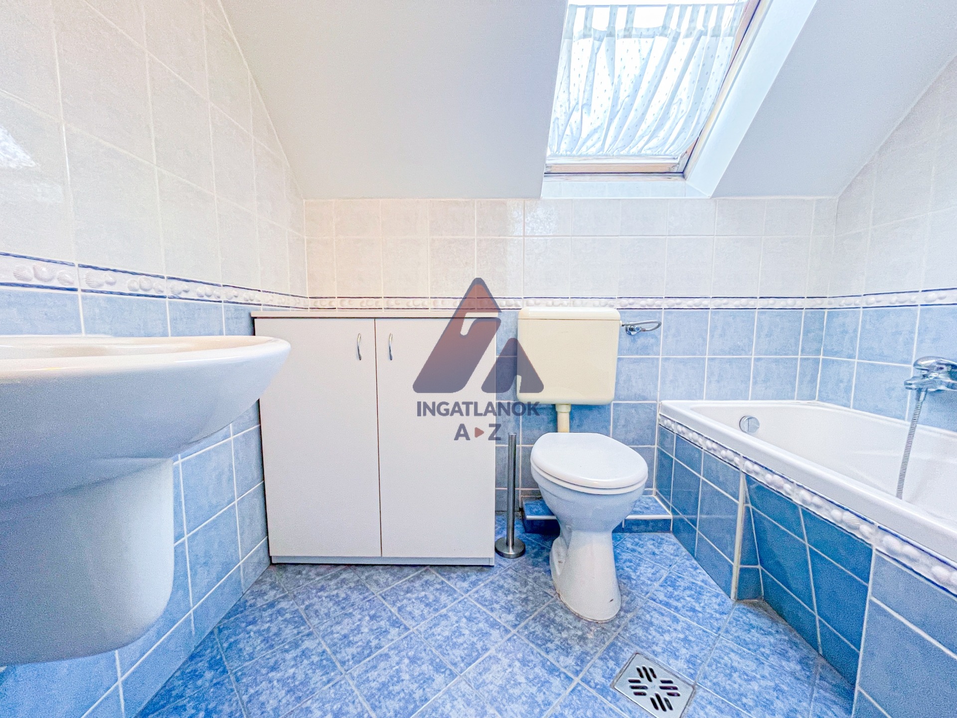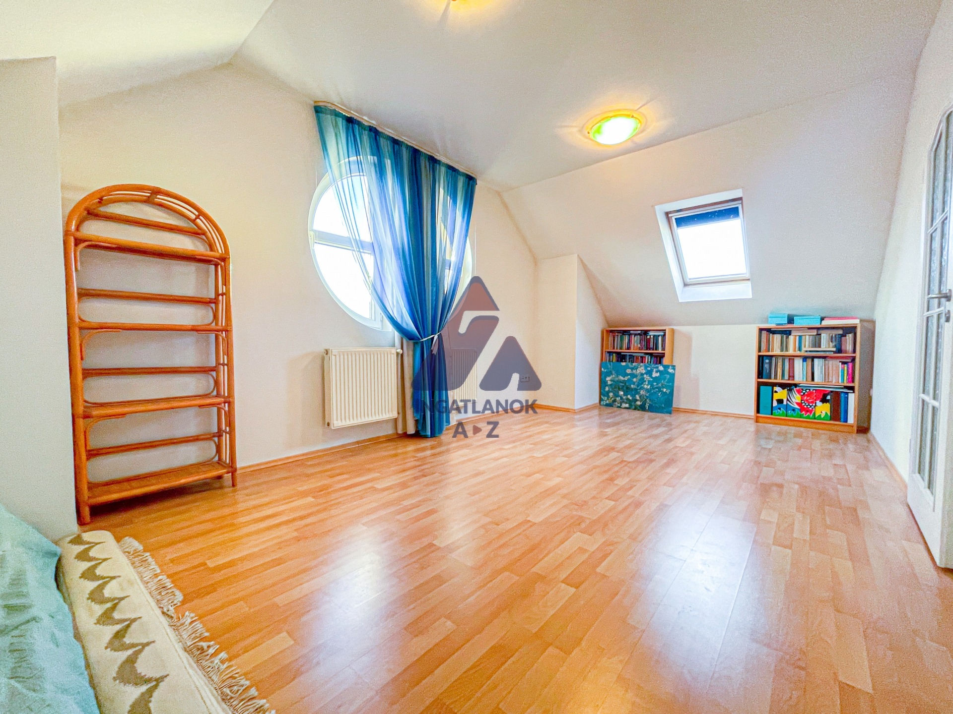 A felső szint a nappali sarkában szolidan meghúzódó kétkaros lépcsőn elérhető, ahol egy nagyobbacska fürdő és egy óriási szoba kapott helyett. Mivel a fenti helyiség úgy lett kialakítva hogy könnyedén megfelezhető és akár két egyforma méretű szobává is alakítható akár négy szobás családi otthont is alakíthatunk.